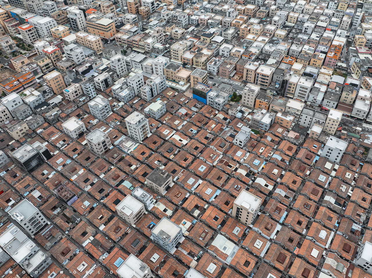 潮汕的人们总在紧紧团结在一起,潮汕的建筑也总是密密相靠在一起,于是这里的民居如同平铺的乐高一般,高低交织在了一起,俯瞰的视角里很是奇妙。